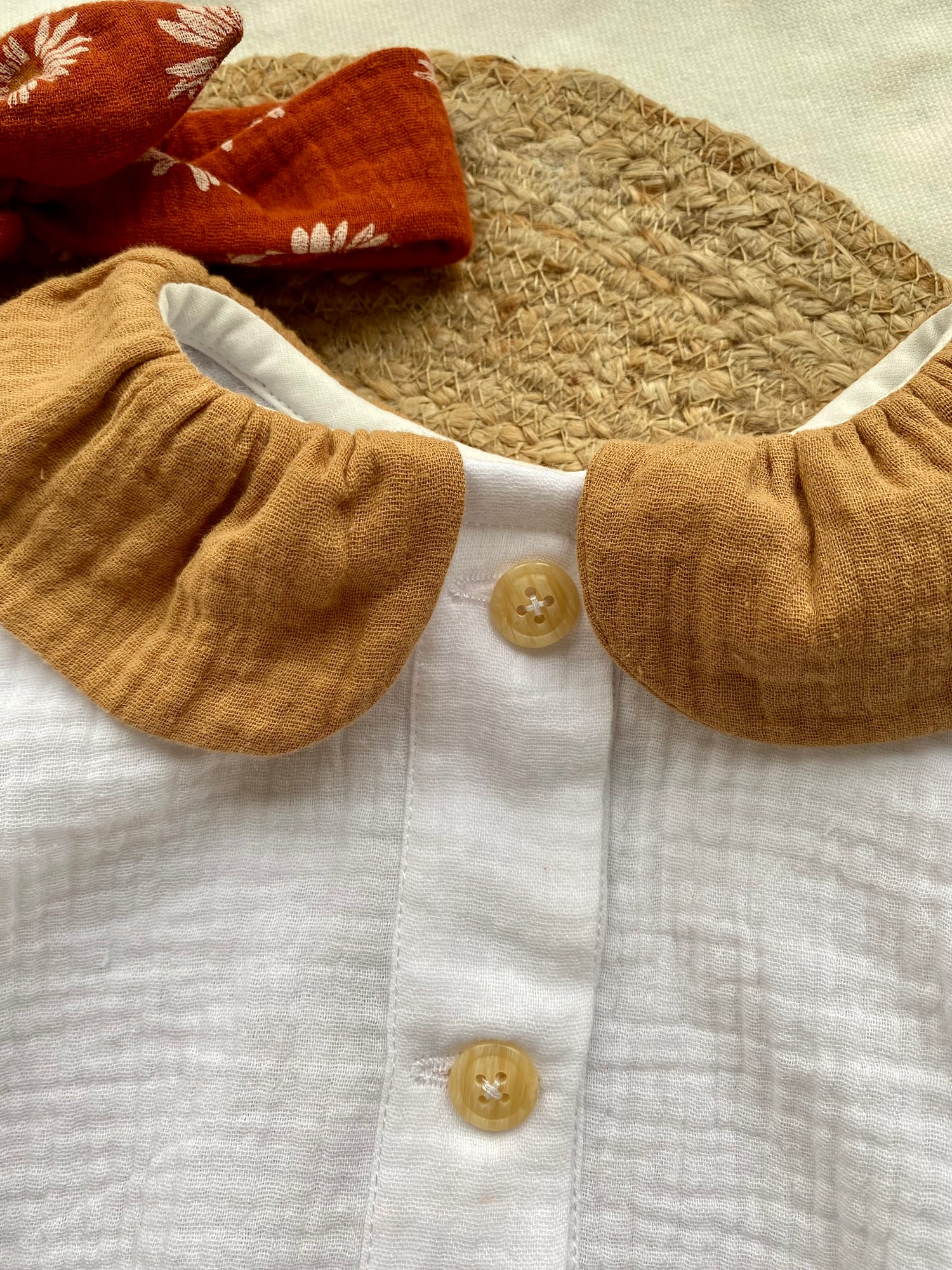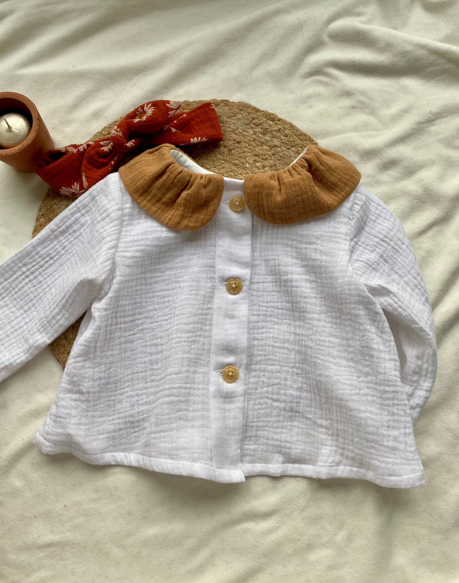 Vous pouvez glisser cette blouse sous un pull et ne laisser que le col dépasser pour l'hiver. Et l'été l'associer avec une barboteuse pour une jolie tenue.