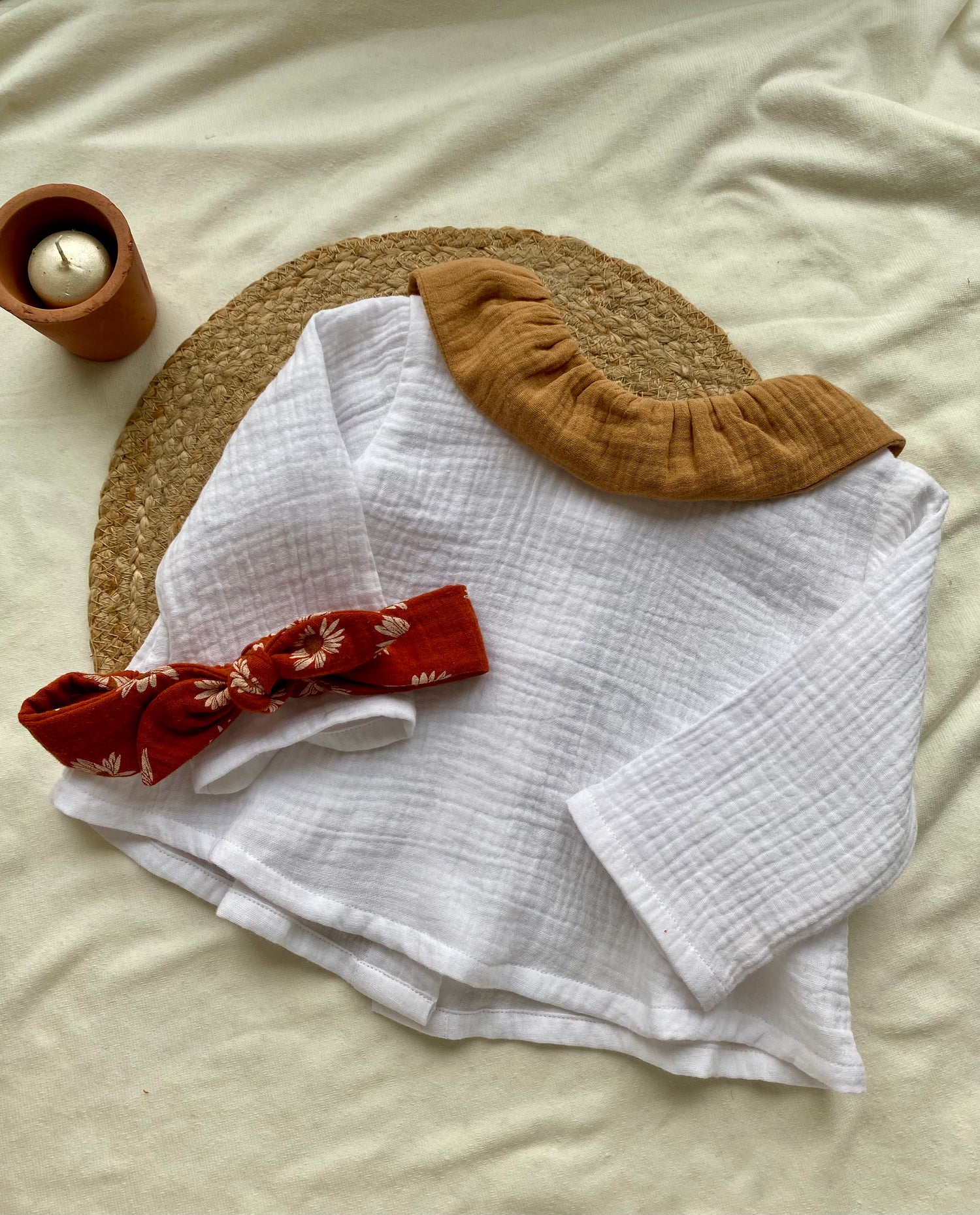 Cette blouse avec son col volanté va vous permettre de vous amusez à créer de jolies looks pour vos bébés.