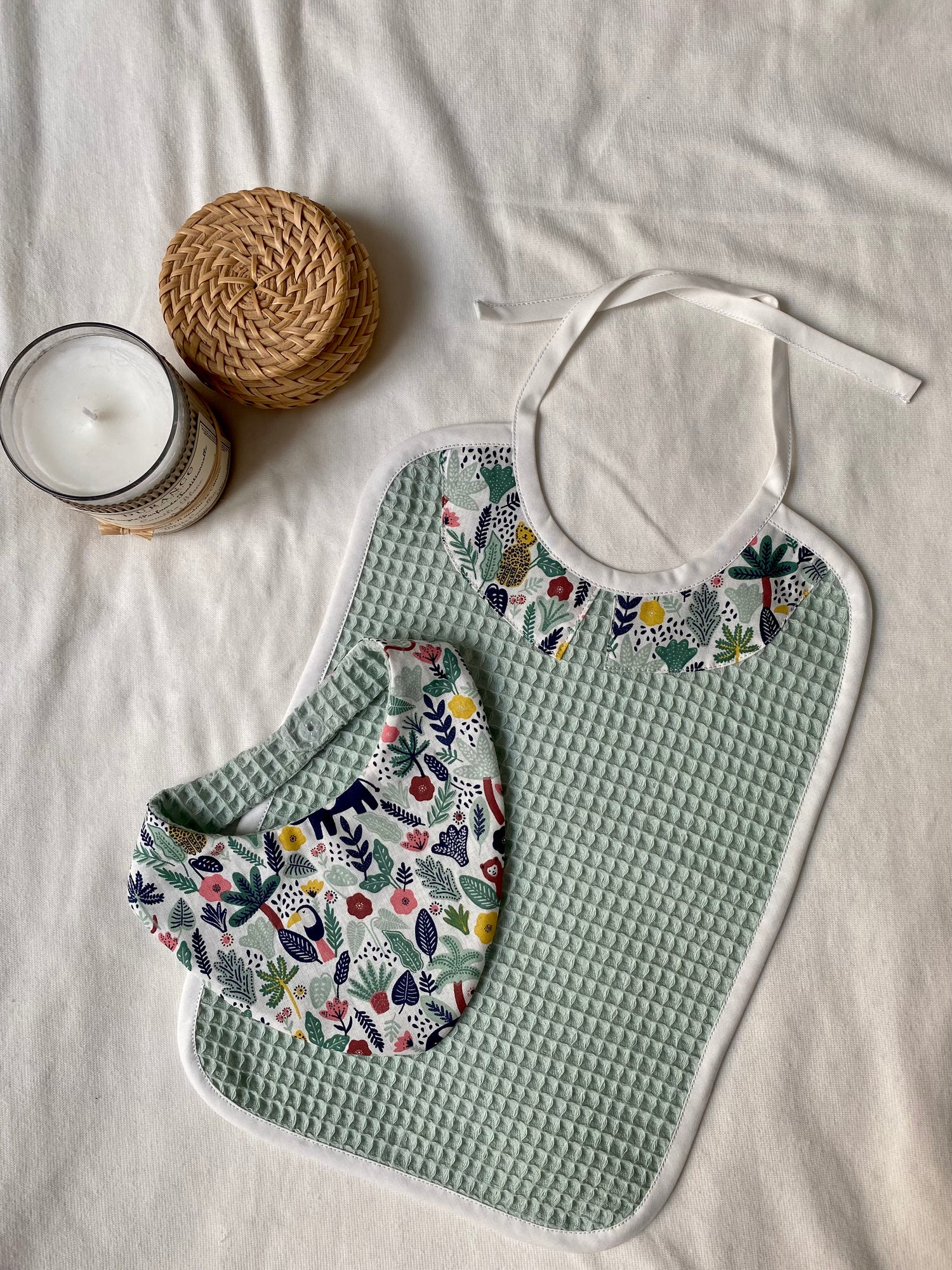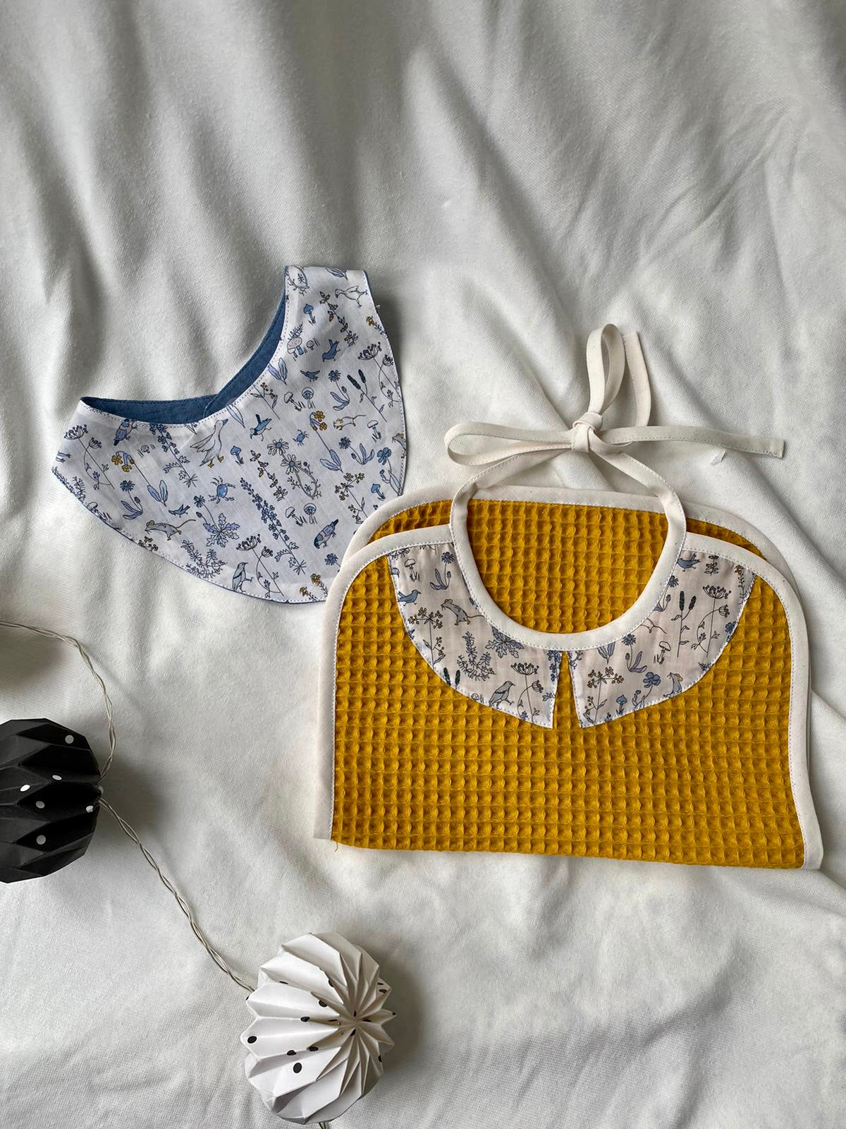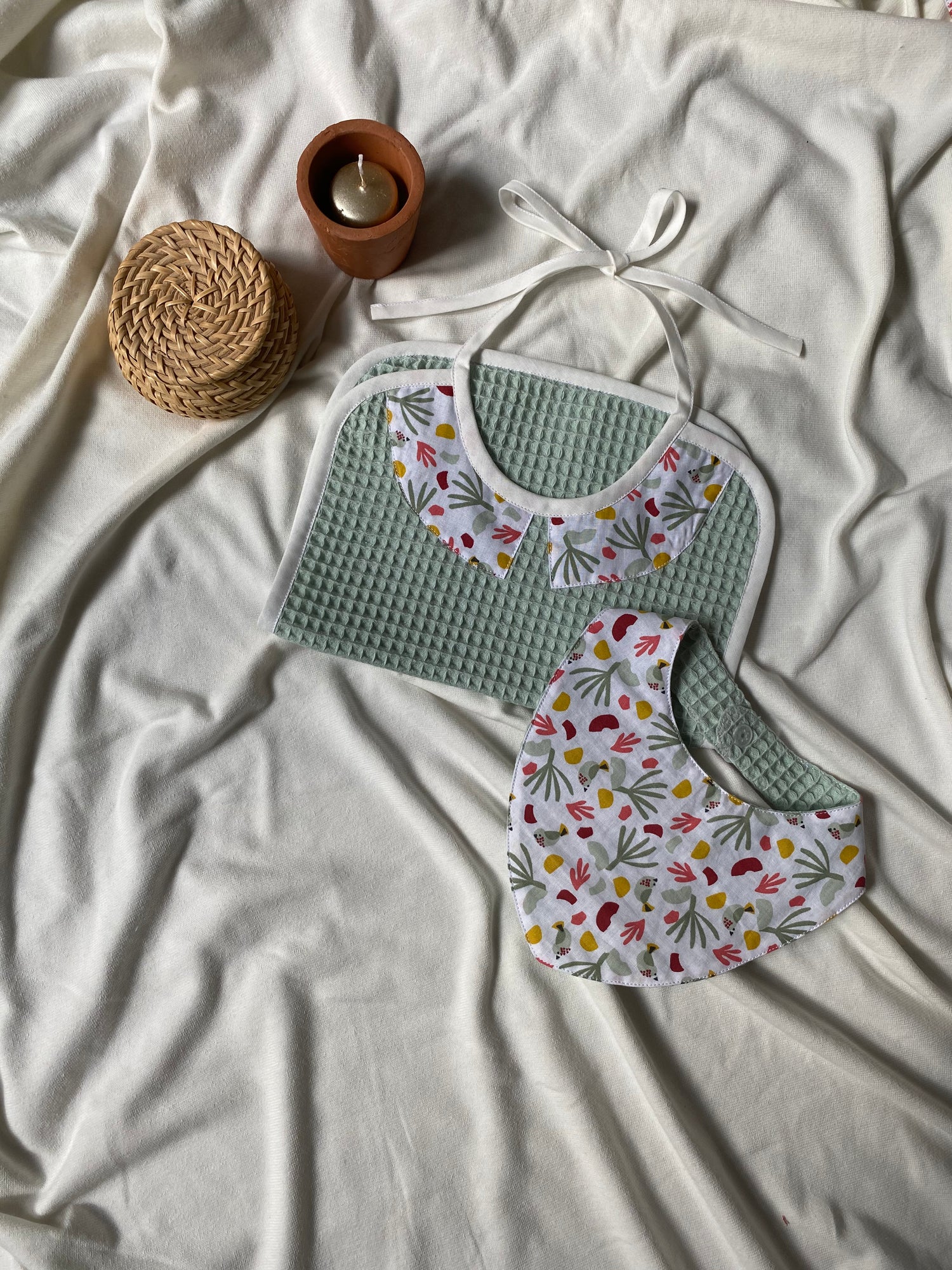 Ce lot est composé d'un bavoir à nouer pour les repas de bébé et d'un bavoir bandana pratique pour les poussées dentaires.