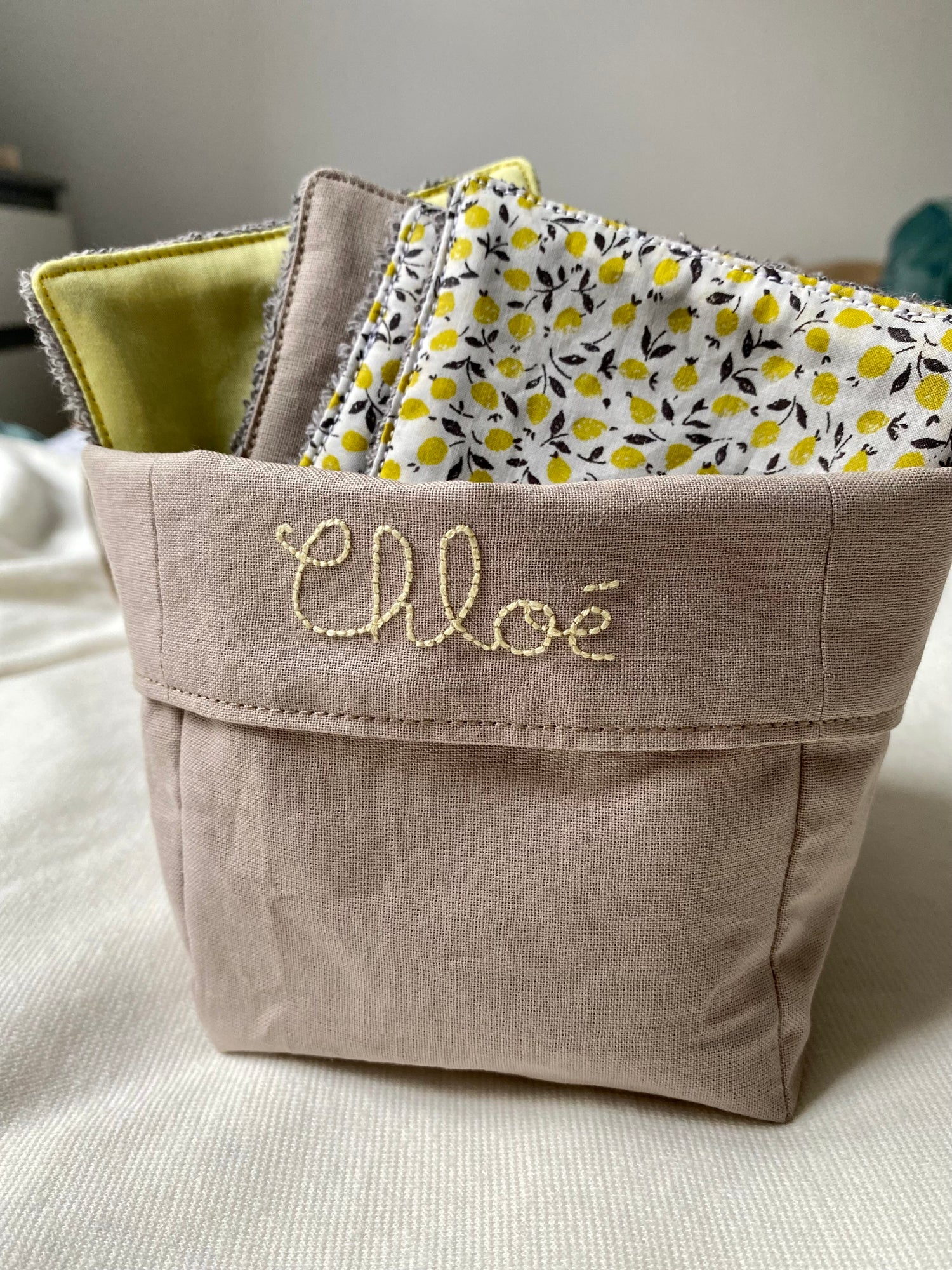 Possibilité de broder le prénom de bébé sur le panier de rangement pour 5€.