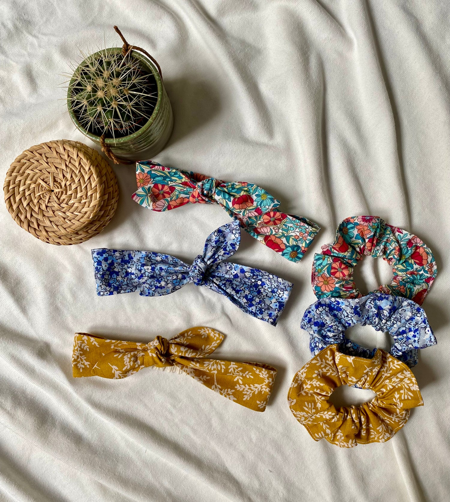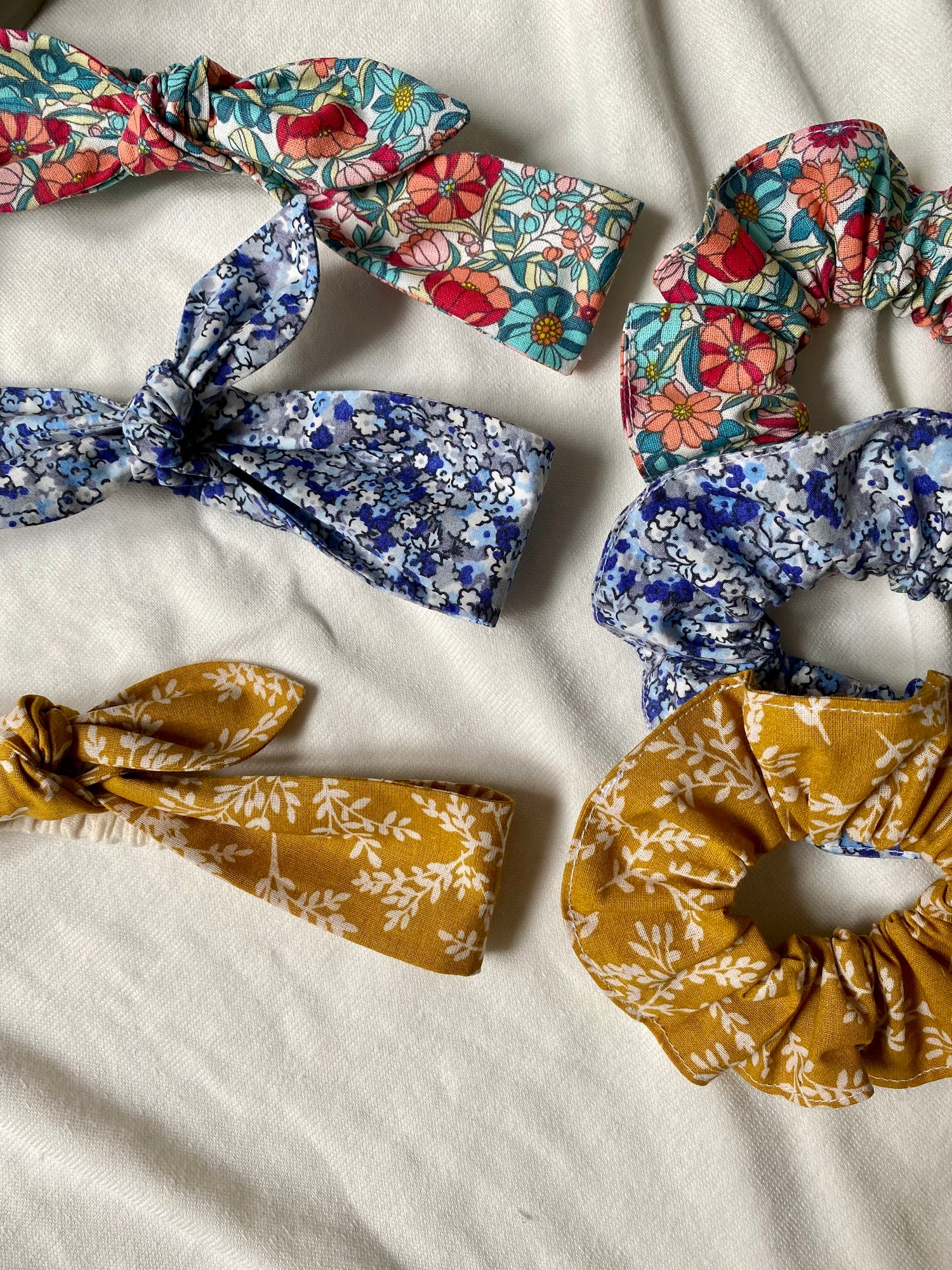 Voici le lot qui comporte un bandeau à nouer pour bébé et le chouchou assorti pour maman.