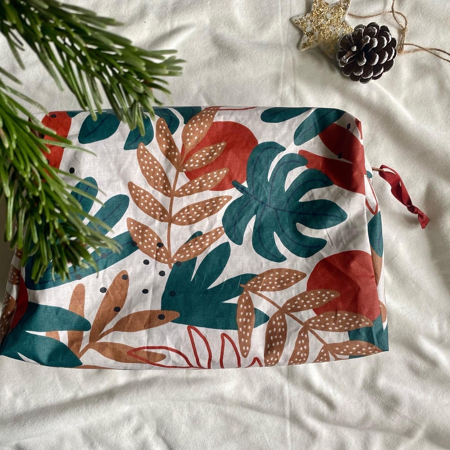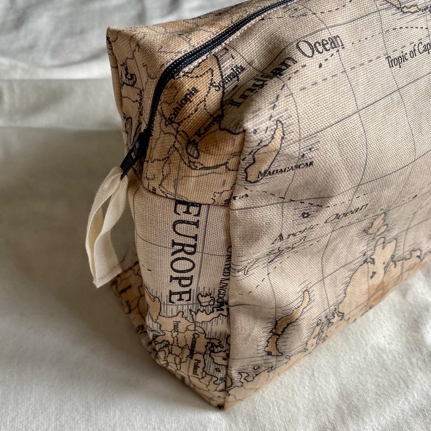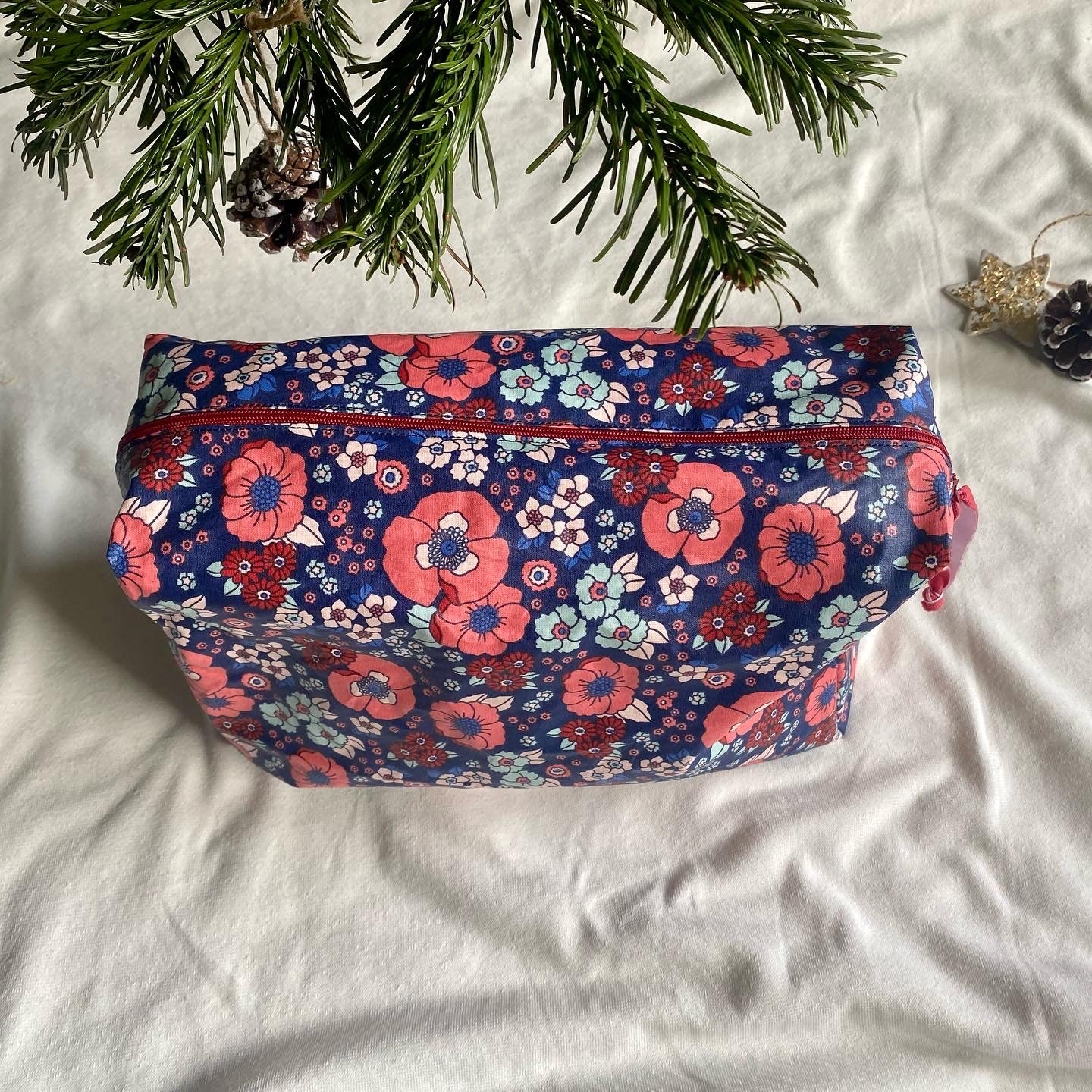 Trousse de toilette avec doublure en tissu enduit pour faciliter le nettoyage.